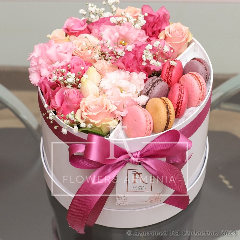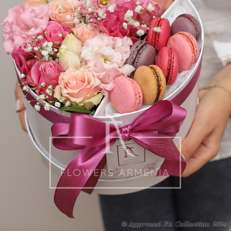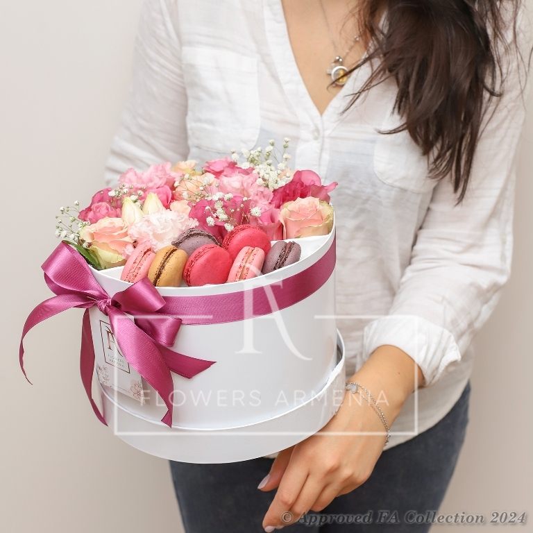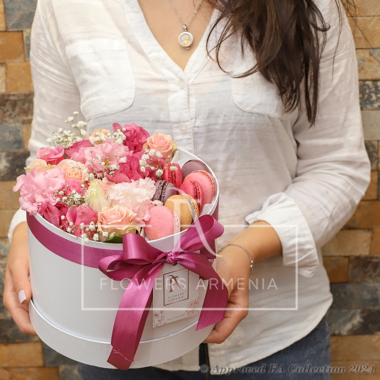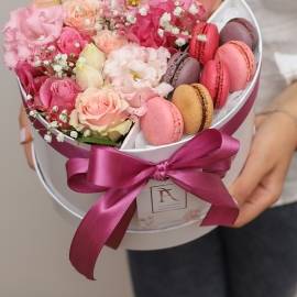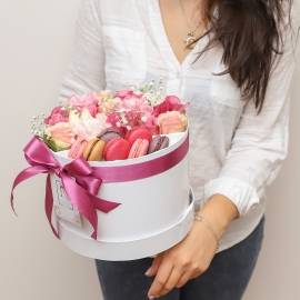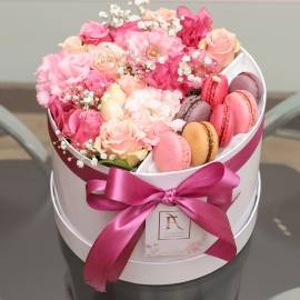 This mini-box flower and macarons display is nothing short of impressive. We have selected a variety of pastel-coloured blooms paired with a touch of greenery and sweet to create a truly rich display. Pamper somebody special on their birthday, anniversary or even just because with this elegant hatbox arrangement.