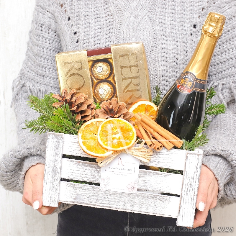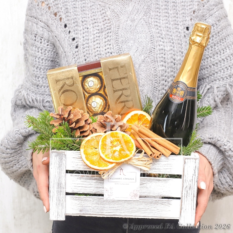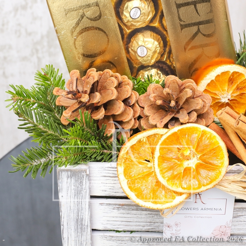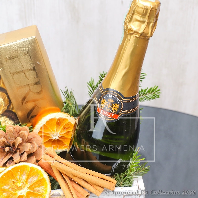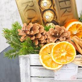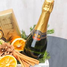 A very elegant basket with Ferrero Rocher candy box, french Champagne La Roche 0.7 L and gentle decorations with spruce branches and oranges. Truly a very delicate gift for holidays too!