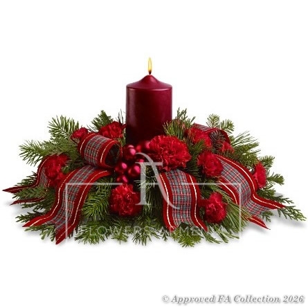 Picture the joy of Christmas, and the faces of family and friends radiant in the warm glow of candlelight around your holiday table. Then bring that charming scene to life with this traditional centerpiece featuring blossoms, artfully arranged around a crystal hurricane cradling a red pillar candle.